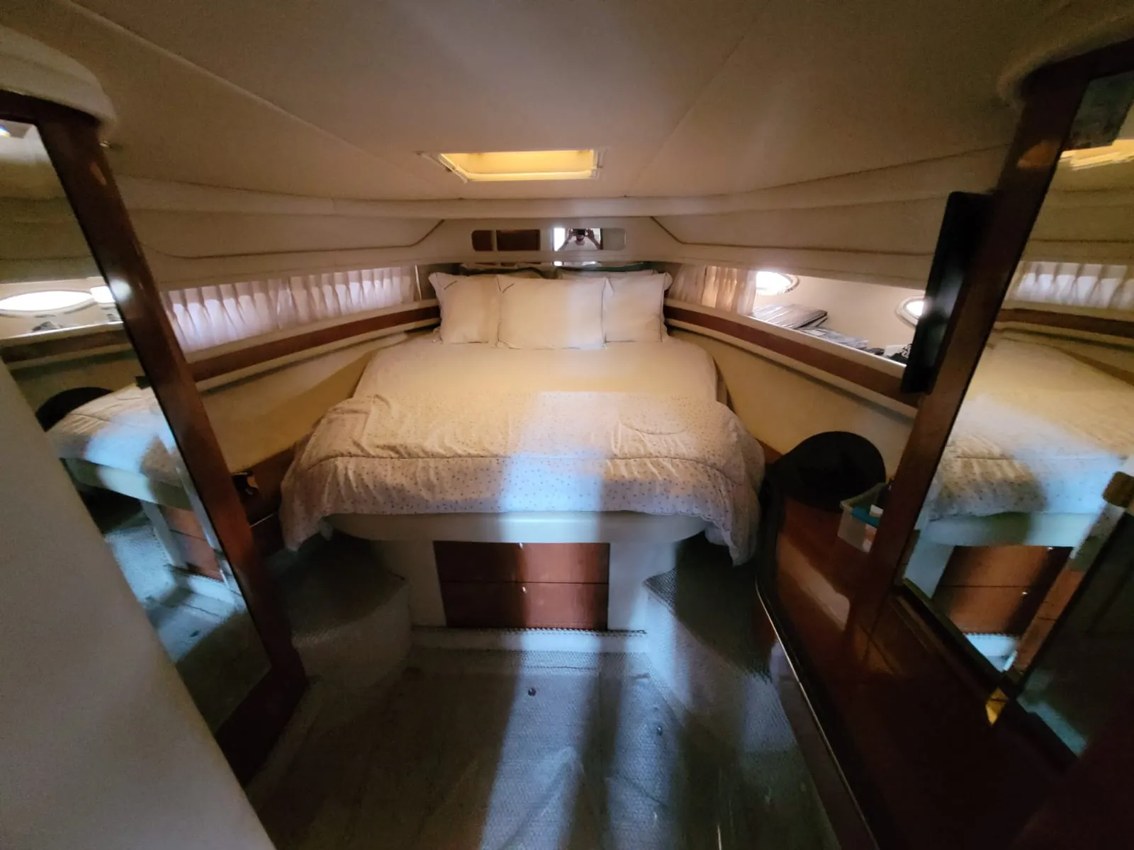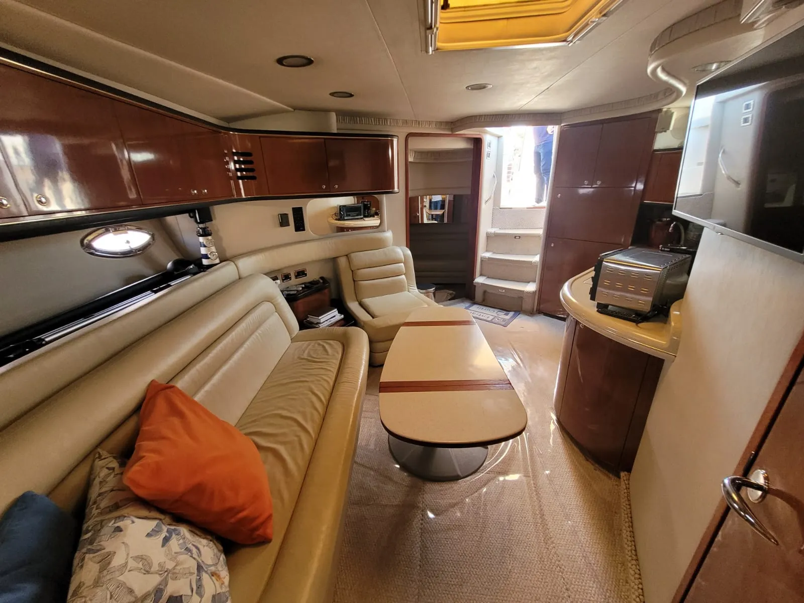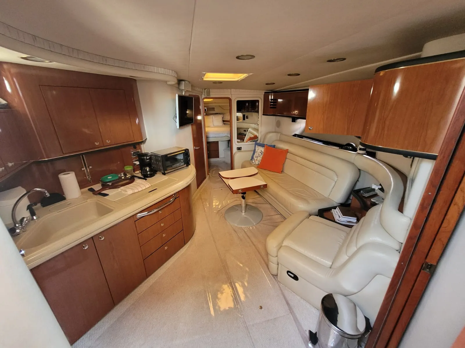 O interior da 515 Sundancer foi projetado para o máximo conforto e conveniência. A embarcação possui dois camarotes privativos, ambos elegantemente decorados. A suíte master na proa, e o segundo camarote com camas de solteiro ou uma cama de casal, garantem privacidade e descanso para todos a bordo. Com dois banheiros completos, o iate oferece toda a praticidade necessária. O salão principal é amplo e bem iluminado, com uma cozinha completa e área de estar para socialização.