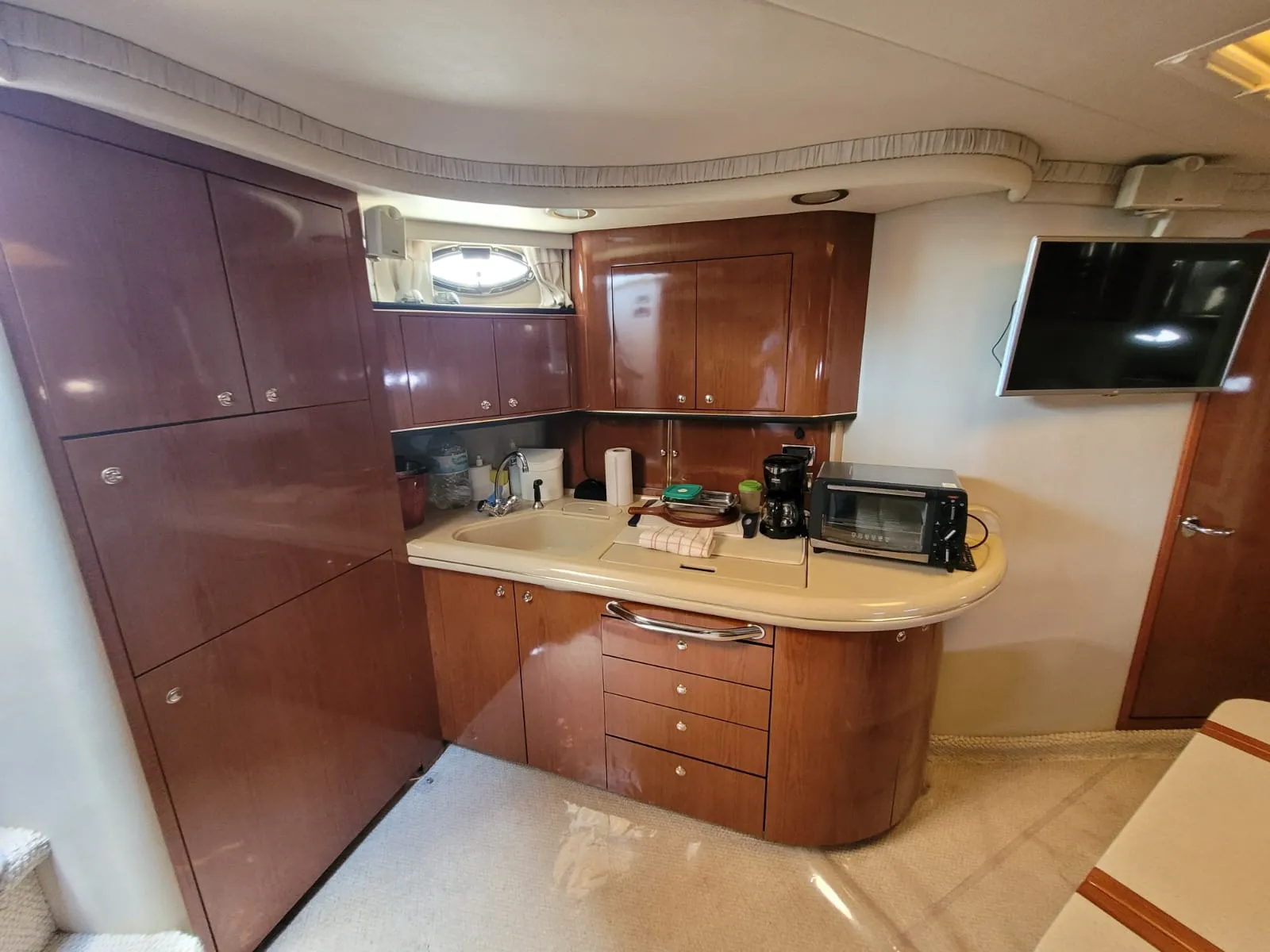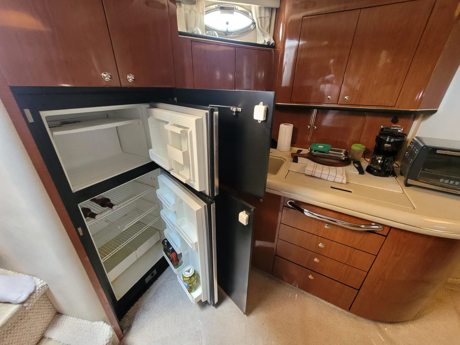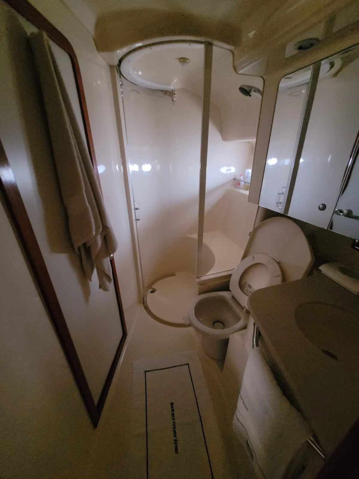 O interior da 515 Sundancer foi projetado para o máximo conforto e conveniência. A embarcação possui dois camarotes privativos, ambos elegantemente decorados. A suíte master na proa, e o segundo camarote com camas de solteiro ou uma cama de casal, garantem privacidade e descanso para todos a bordo. Com dois banheiros completos, o iate oferece toda a praticidade necessária. O salão principal é amplo e bem iluminado, com uma cozinha completa e área de estar para socialização.